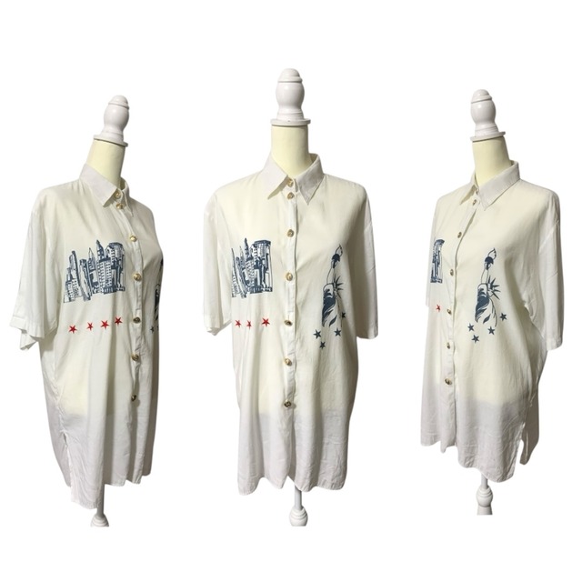 USED シャツ☆NEW YORK スッキリしたラインで着丈も長め! お尻がすっぽり隠れるくらいの長さです♪ 短めに着たい時は裾を結んで着て頂いたりしてもかわいく着て頂けますし、ノースリーブなどの羽織りなどにも使えます♪ 染み込みのプリントで★は刺繍です! 着心地も良くゴールドボタンもポイントです★ サイズ 平置き 肩幅 49cm 身幅 56cm 着丈 81cm ※確認はしておりますが、古着の為、染み・傷等がある場合がございますので、予めご了承くださいませ。 ※配送はクリックポストにてご手配させて頂きます。