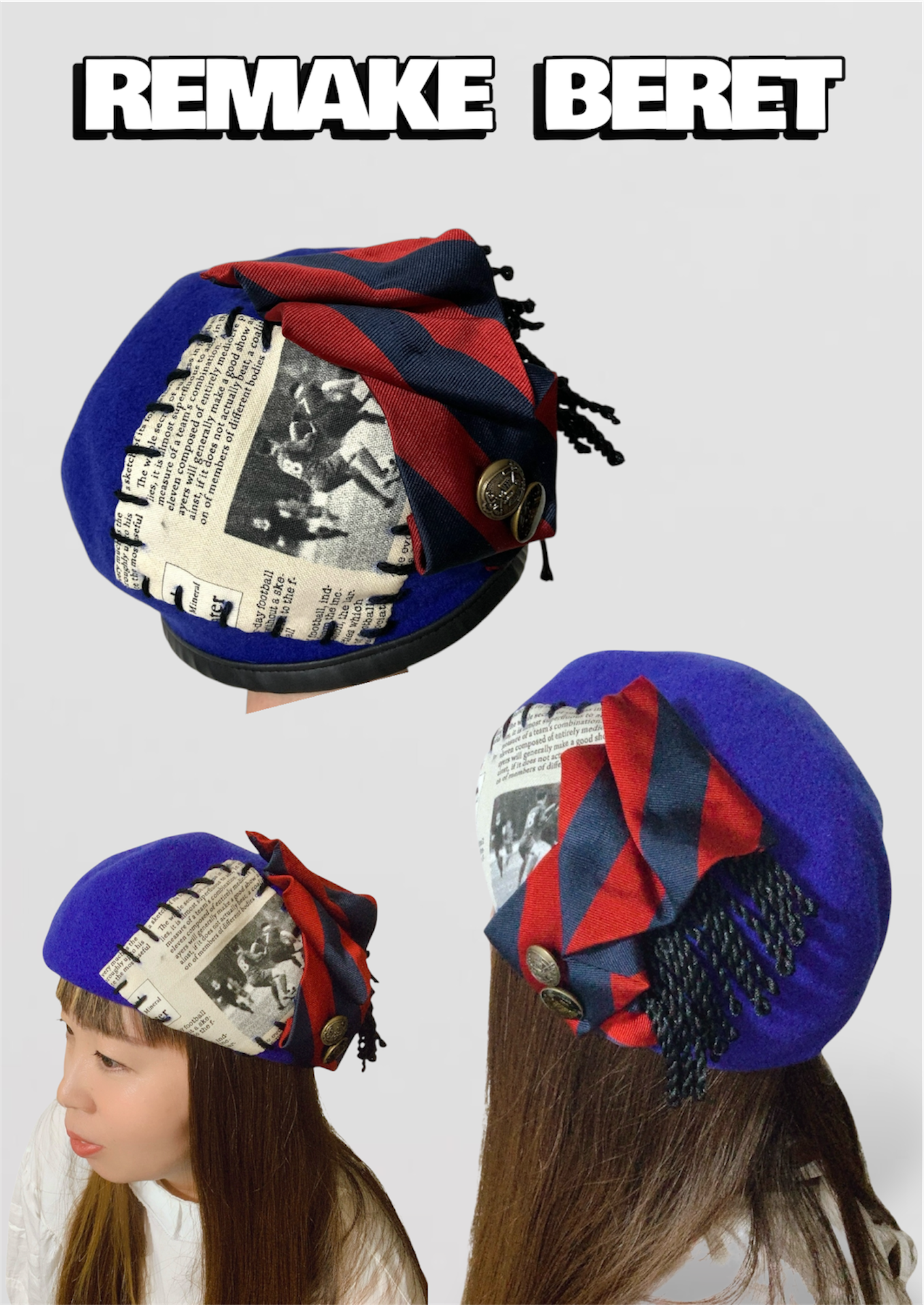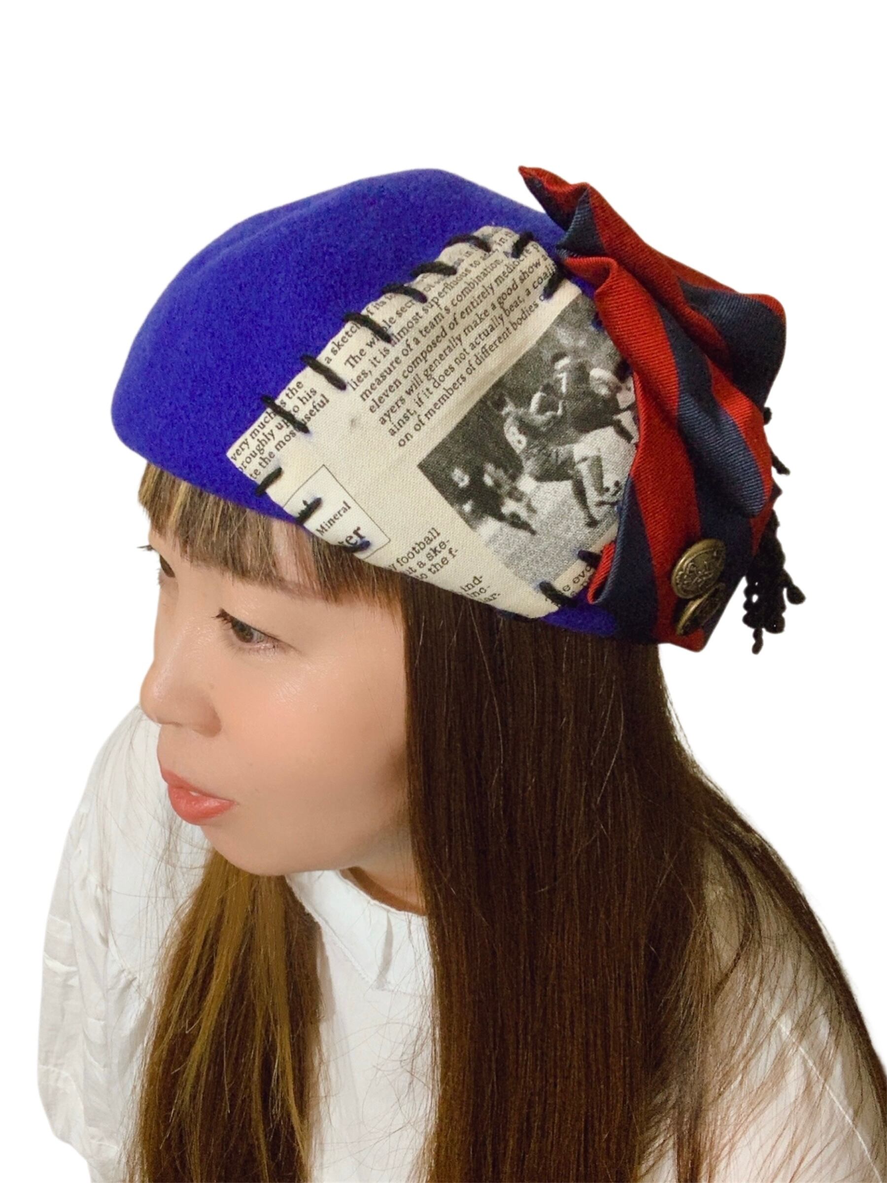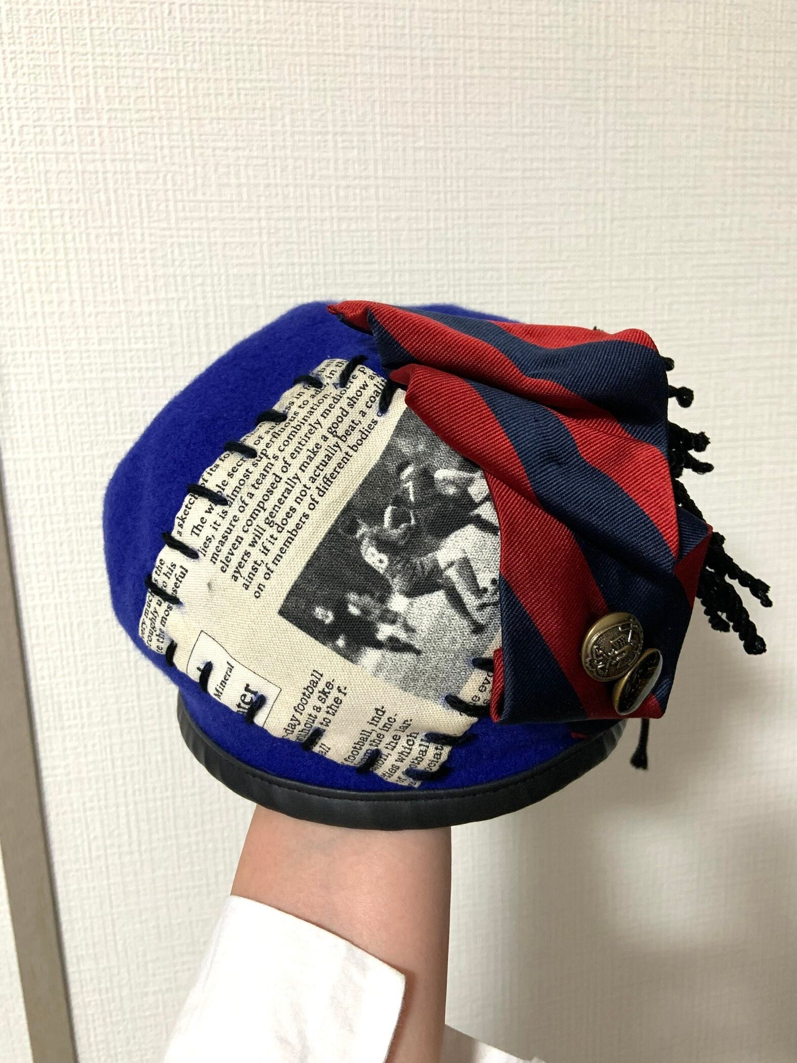 1点もの リメイクベレー帽 footballニュースペーパー柄×ネクタイ×ツイストフリンジ【送料無料】