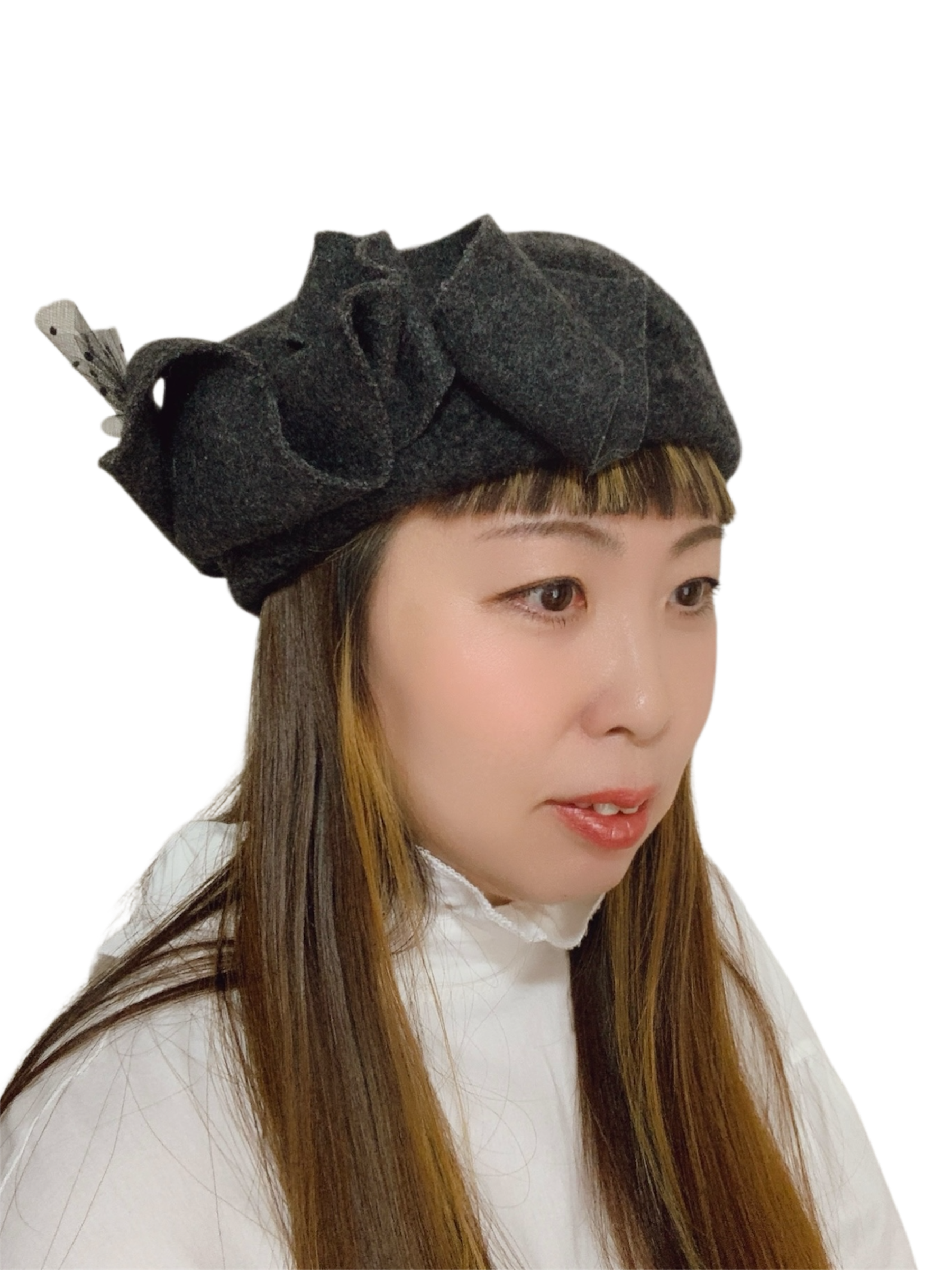 USEDのベレー帽に洋服づくりで出たハギレを活かして仕立てた、サステナブルなリメイクベレー帽♪