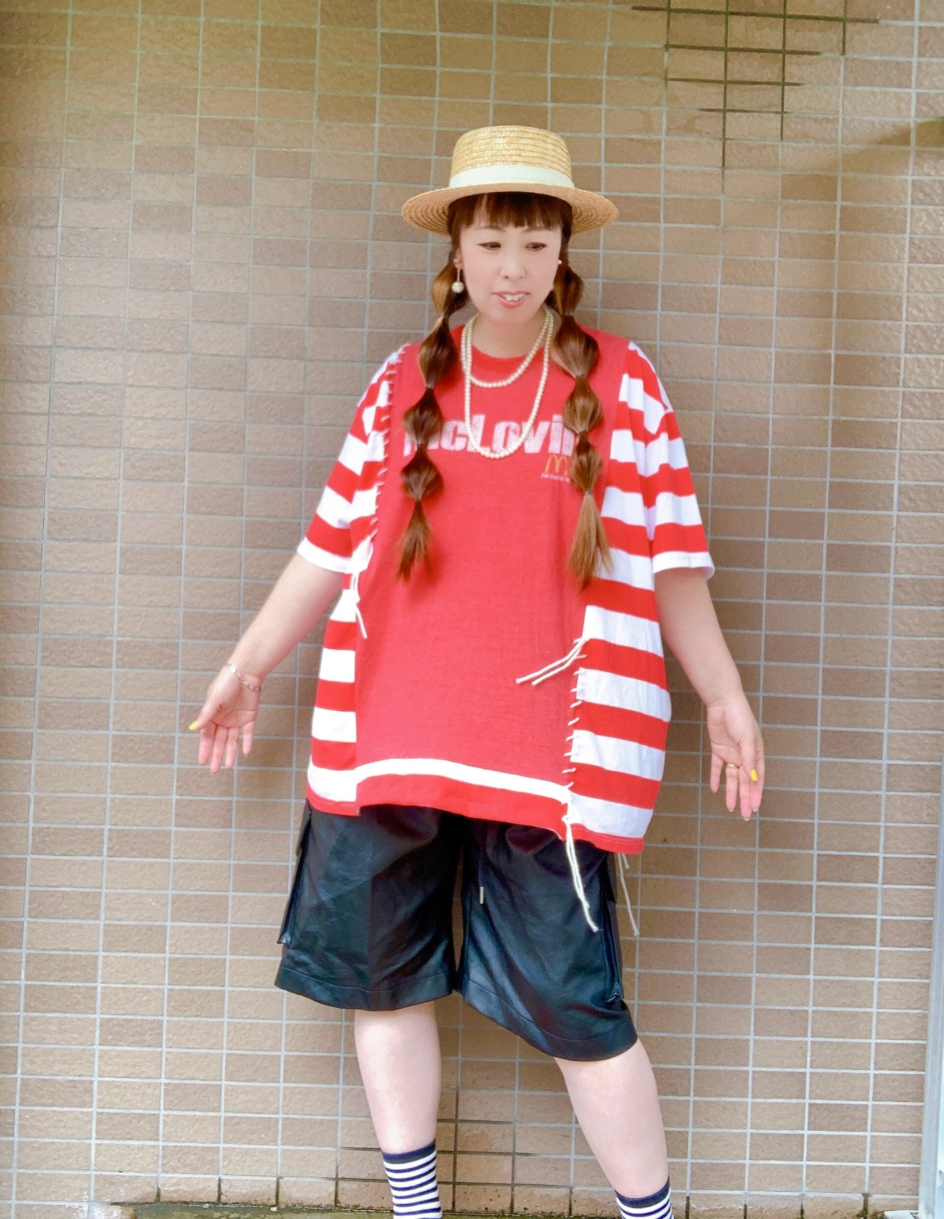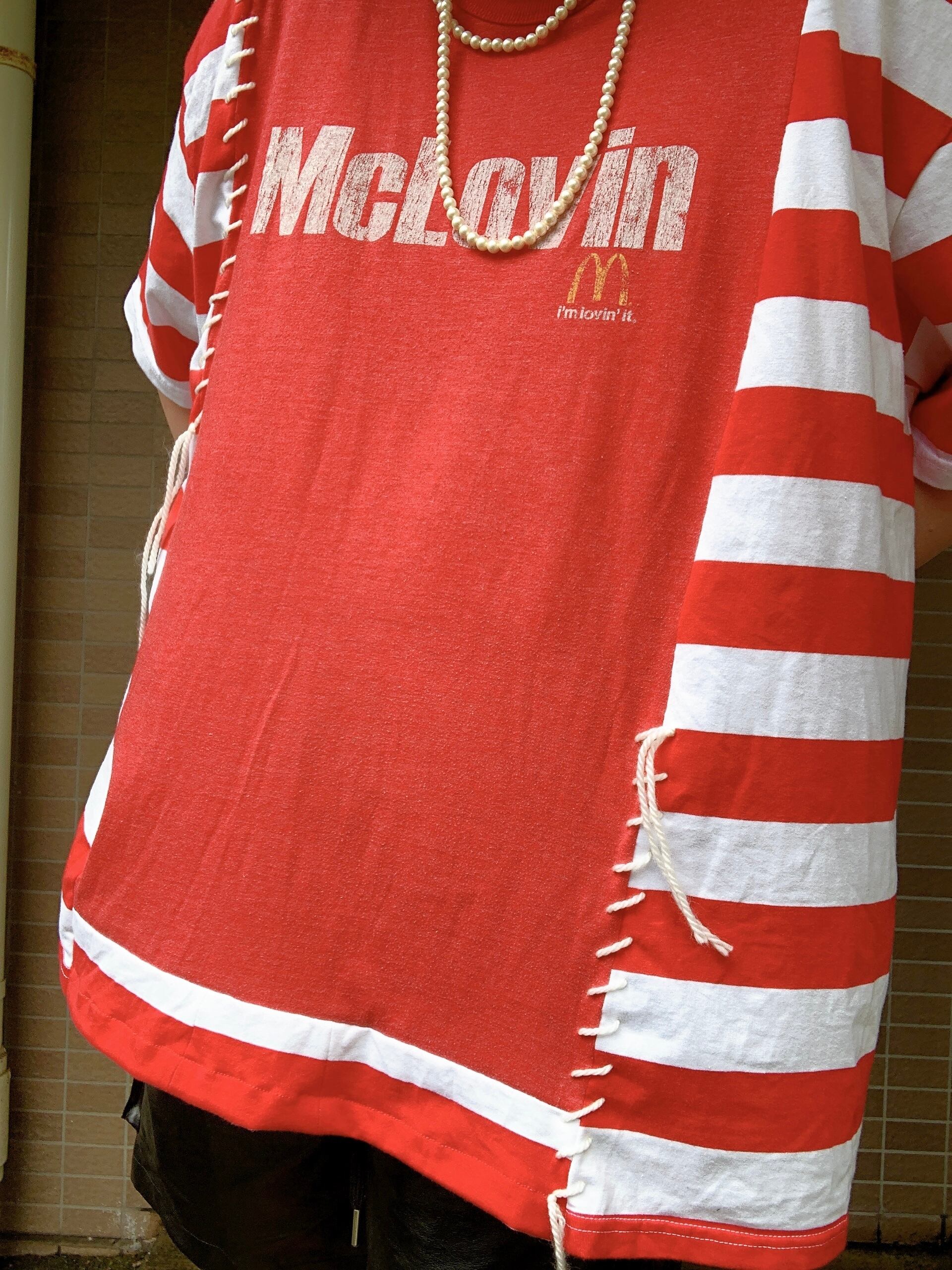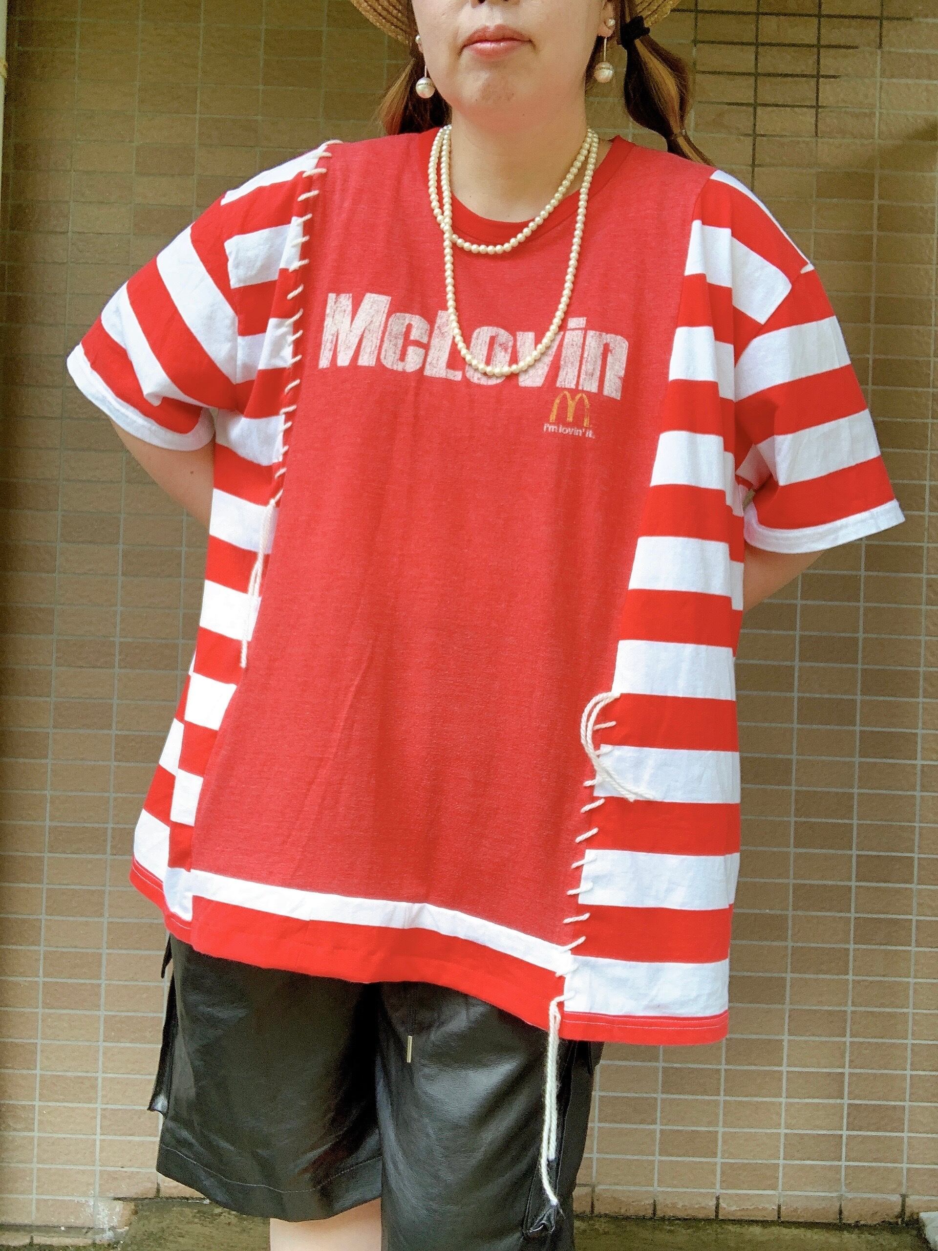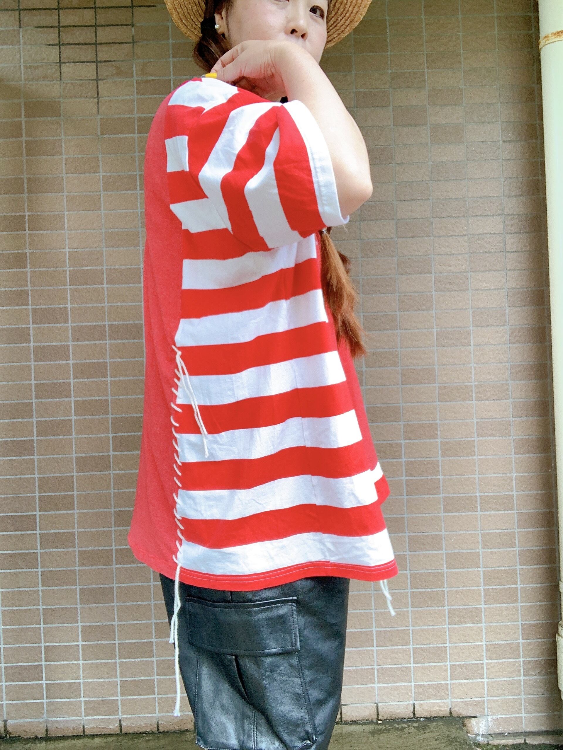 1点もの リメイクドッキングTシャツ ハンドステッチ 赤 リンガー×ボーダー ユニセックス【送料込み】