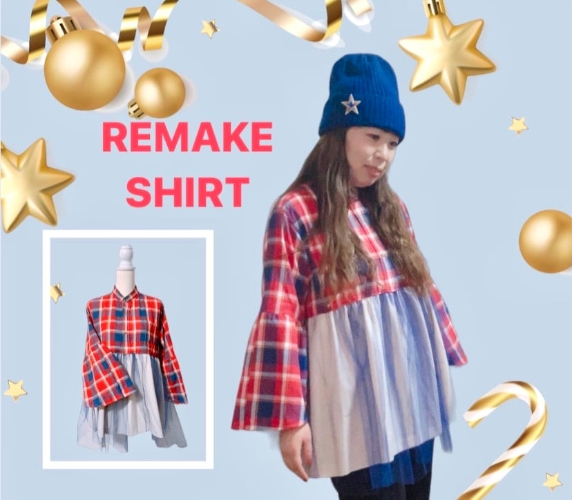 1点もの リメイクチェックシャツ チュールトップス【送料無料】